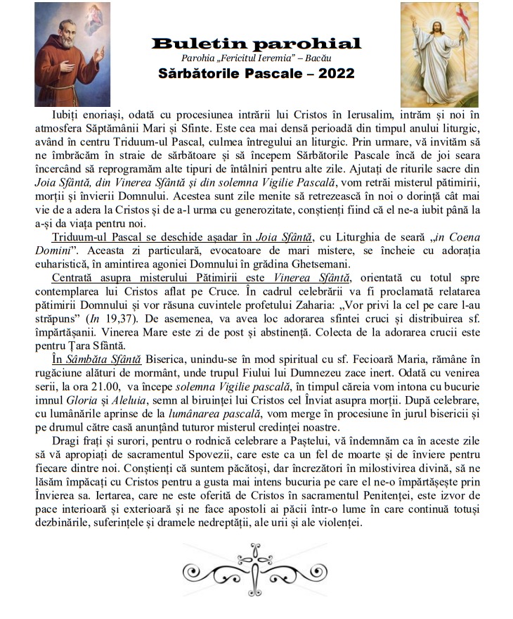 • La ieșirea din biserică veți putea lua un Buletin Parohial în care veți găsi printre altele și programul complet pentru Săptămâna Sfântă și pentru zile de Paști precum și alte anunțuri de interes general. Buletinul parohial a fost postat și pe situl parohiei precum și pe pagina de FB.