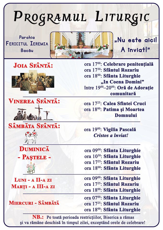 Vă anunțăm că în biserica noastră, Fer. Ieremia vom continua programul zilnic obișnuit și vom celebra cu biserica închisă Sfintele Liturghii de dimineața (ora 6.50) și seara (ora 18.00). Recităm zilnic Sf. rozariu înainte de sf Liturghie de seara iar miercuri și vineri parcurgem Calea Sfintei Cruci.
