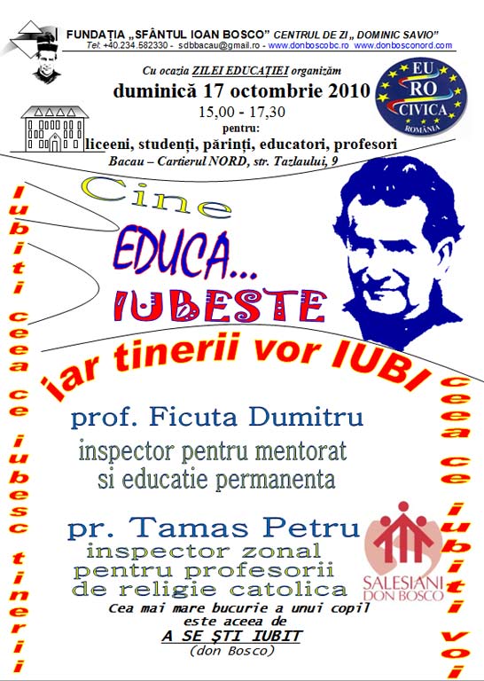 Fundația salezianã "Sfântul Ioan Bosco" din Bacãu, str. Tazlãului, 9, în colaborare cu Asociația Eurocivica, organizeazã a III-a ediție a ZILEI EDUCAțIEI, duminicã, 17 octombrie 2010, între orele 15,00 - 17,30 pentru: liceeni, studenți, pãrinți, educatori, profesori. În prima ediție, anul 2008, am avut ocazia de a o asculta pe prof. Irina Leonte, inspector de religie, Asupra situației învãțãmântului religios; pr. Eduard-Mihai Coşa, director spiritual la Seminarul Teologic Liceal "Sf. Iosif", ne vorbise despre faptul cum Educația este viața însãşi; dl. Dragoş Bãlan, din partea Direcției generale de asistențã socialã şi protecție a copilului a actualizat Rolul comunitãții în integrarea socio-profesionalã a tinerilor care provin din sistemul de protecție, şi în final prof Agneza Grosu ne-a sintetizat în mod admirabil SISTEMUL PREVENTIV AL LUI DON BOSCO. Totul se încheiase cu prezentarea unui model de profesor, Randy Pausch, din partea prof. Claudia Sabãu. Anul trecut, 2009, am avut oportunitatea de a reflecta mai mult asupra educatorului, privind latura sa de animator socio-educativ; cu acest prilej, dna. Oana Cucu, de la inspectoratul şcolar Bacãu, a dorit sã ne prezinte tema Optimizarea comunicãrii în relația profesor-elev; prof. Danisia Dumea, director la şcoala Generalã "Mihail Sadoveanu" ne-a introdus în tema Profesor = educator?; prof. Florentina Vieru, director la şcoala generalã "Ion Creangã", ne-a amintit Etica în unitãțile şcolare; din partea Serviciului Public de Asistențã Socialã (SPAS) Bacãu, ni s-a vorbit despre Importanța serviciilor sociale locale în educația şi dezvoltarea copilului, iar pr. Farcaş Alois sdb, din partea comunitãții saleziene din Constanța, a clarificat efectiv PROFILUL ANIMATORULUI SOCIO-EDUCATIV. Continuãm formarea noastrã, iar anul acesta, dupã cuvântul de primire, îl vom asculta pe prof. Ficuta Dumitru, inspector pentru mentorat şi educație permanentã, şi dupã care, pr. Tamaş Petru, inspector zonal pentru profesorii de religie catolicã, care ne vor încuraja în munca noastrã de educatori, persoane adulte ce educã, iubind. Apoi suntem invitați la reflexii şi intervenții libere, dialogând asupra educației şi cãutând soluții concrete în a fi mãrturisitori autentici ai iubirii lui Dumnezeu pe acest pãmânt. Va urma un spectacol artistic oferit de grupurile din Oratoriul salezian "don Bosco". Preşedintele Fundației, pr. Venceslau Grosu sdb Cea mai mare bucurie a unui copil este aceea de A SE ȘTI IUBIT (don Bosco)